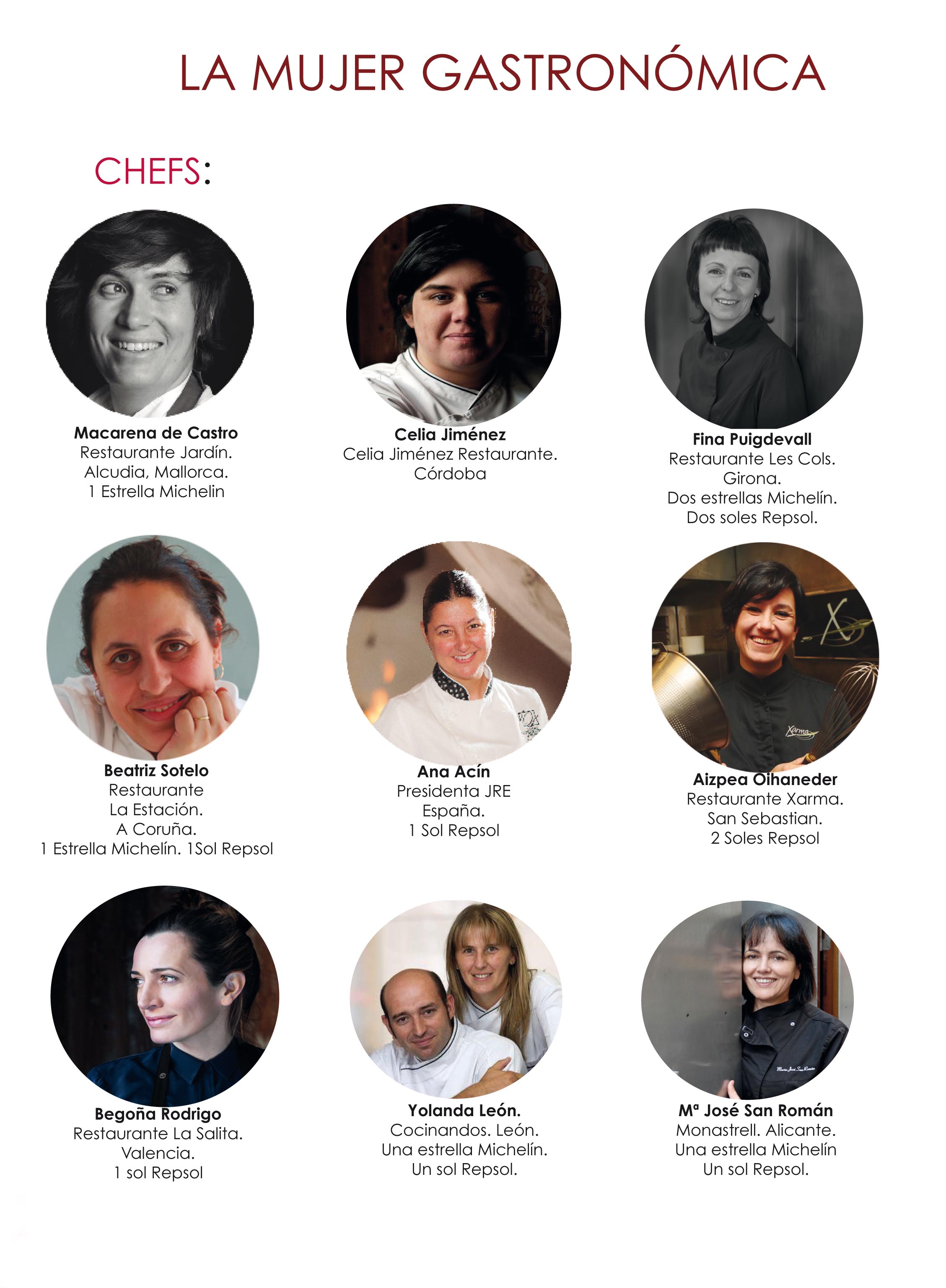 Algunas de las chef que participarán en este congreso dentro de las mesas de debate programadas son Ana Acín (presidenta de JRE-España y propietaria de Venta del Sotón con un sol Repsol), Fina Puigdevall (Les Cols. Dos estrellas Michelín. Dos soles Repsol), Macarena de Castro (Restaurante Jardín. Una estrella Michelín. Dos sol Repsol), o Begoña Rodrigo (La Salita. Un sol repsol. Ganadora Top Chef).